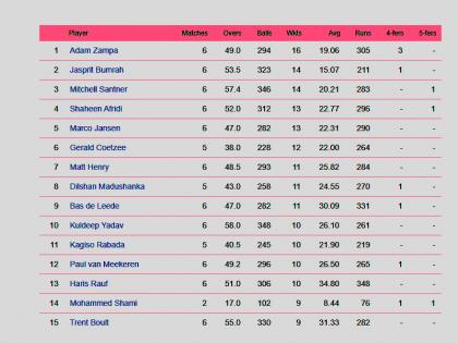 भारत के तेज गेंदबाज जसप्रीत बुमराह 14 विकेट के साथ दूसरे स्थान पर पहुंच गए। न्यूजीलैंड के स्पिनर मिचेल सेंटनर ने 14 विकेट लिए हैं। 45 ग्रुप स्टेज मैचों के अंत में अंक तालिका में शीर्ष चार टीमें सेमीफाइनल में पहुंचेंगी, जो 15 और 16 नवंबर को होंगे। फाइनल 19 नवंबर को अहमदाबाद में होगा।