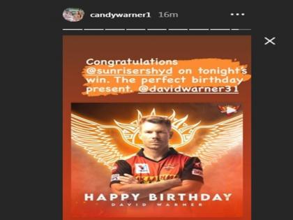 टीम को मिली शानदार जीत के बाद डेविड वॉर्नर की वाइफ कैंडिस वॉर्नर ने एक प्यारा पोस्ट अपने इंस्टा स्टोरी पर की। कैंडिस ने हैदराबाद की जीत पर लिखा, मुबारकबाद सनराइजर्स हैदराबाद, वॉर्नर के जन्मदिन पर इससे बेहतर तोहफा नहीं हो सकता था, परफेक्ट बर्थडे गिफ्ट।' इस जीत के बाद सनराइजर्स 12 मैचों में 10 अंक लेकर छठे स्थान पर है और अभी प्लेआफ की दौड़ से बाहर नहीं हुई है।