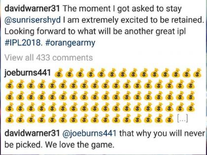वॉर्नर को रिटेन किए जाने के निर्णय का सभी फैन्स ने स्वागत किया है, लेकिन ऑस्ट्रेलियाई क्रिकेटर जो बर्न्स ने उन पर पैसे को लेकर तंज कसा। जिस पर वॉर्नर ने भी जोरदार हमला बोला। बर्न्स ने वॉर्नर की पोस्ट पर 'मनी बैग्स' का इमोजी पोस्ट किया। इसके बाद वॉर्नर ने जवाब देते हुए लिखा, इसी वजह से तुम कभी चुने नहीं जाओगे। हमें खेल से प्यार है। हालांकि बाद में जो बर्न्स ने अपने कमेंट को डिलीट कर दिया।