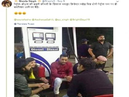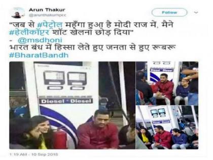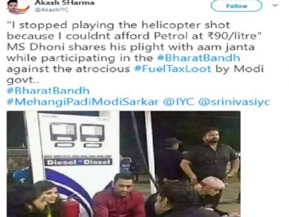 इस तस्वीर और ट्विटर और फेसबुक पर जमकर शेयर किया जा रहा है। साथ ही कुछ ट्विट्स में दावा किया जा रहा है कि धोनी ने कहा है कि उन्होंने हेलिकॉप्टर शॉट इसलिए खेलना बंद कर दिया, क्योंकि पेट्रोल के दाम 90 रुपये प्रति लीटर के पास पहुंच गये हैं। ऐसे ही कुछ और ट्वीट धोनी की तस्वीर के साथ सोशल मीडिया पर हैं।![]()