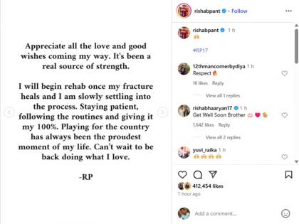 पंत ने एक्स (जिसे पहले ट्विटर के नाम से जाना जाता था) पर लिखा, "आप सभी के प्यार और शुभकामनाओं के लिए आभारी हूँ। यह मेरे लिए वाकई ताकत का स्रोत रहा है। फ्रैक्चर ठीक होने के बाद मैं रिहैबिलिटेशन शुरू करूँगा और धीरे-धीरे इस प्रक्रिया में ढल रहा हूँ। धैर्य बनाए रख रहा हूँ, अपनी दिनचर्या का पालन कर रहा हूँ और अपना 100% दे रहा हूँ।" उन्होंने आगे कहा, "अपने देश के लिए खेलना हमेशा से मेरे जीवन का सबसे गौरवपूर्ण पल रहा है। मैं उस काम को फिर से करने के लिए बेताब हूँ जो मुझे पसंद है।"