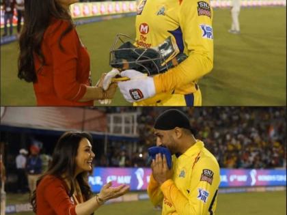 हरभजन सिंह ने अपने इंस्टाग्राम स्टोरी में एक कोलाज शेयर किया है, जिसमें पहली फोटो में एमएस धोनी प्रीति जिंटा से हाथ मिलाते नजर आ रहे हैं और दूसरी फोटो में हरभजन सिंह प्रीति जिंटा के साथ हाथों में तौलिया लिए दिख रहे हैं।