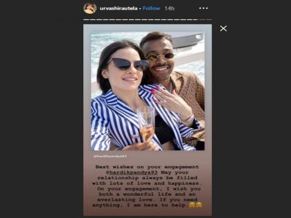 उर्वर्शी रौतेला ने इंस्टाग्राम स्टोरी शेयर की है, जिसमें उन्होंने हार्दिक पंड्या और नताशा स्टेनकोविक को सगाई की बधाई दी और कहा कि किसी भी तरह की जरूरत हो तो वह हमेशा उनके साथ मौजूद हैं।
