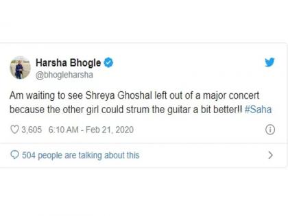 उन्होंने अपने दूसरे ट्वीट में लिखा, 'मैं उस दिन का इंतजार कर रहा हूं जब किसी बड़े कॉन्सर्ट से श्रेया घोषाल को सिर्फ इसलिए बाहर कर दिया जाए, क्योंकि दूसरी लड़की गिटार थोड़ा बेहतर बजा लेती है।' हालांकि बाद में हर्षा भोगले ने अपने इस ट्वीट को डिलीट कर दिया, लेकिन तब तक यह वायरल हो चुका था।