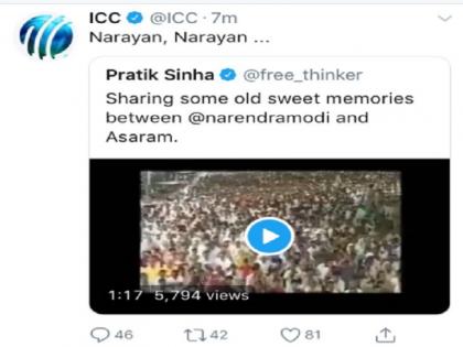 दरअसल, आसाराम पर फैसला बुधवार दोपहर आया। इसके कुछ देर बाद ही आईसीसी के आधिकारिक ट्विटर हैंडल से सोशल मीडिया पर वायरल आसाराम के साथ पीएम मोदी का एक पुराना वीडियो रीट्विट हुआ। इसके बाद सोशल मीडिया पर इसे लेकर आलोचना शुरू हो गई। आईसीसी को जब विवाद के बारे में मालूम चला तो उसने तत्काल ट्वीट हटाते हुए माफी मांग ली। हालांकि, इस बीच विवादित ट्वीट के स्क्रिन शॉट जमकर सोशल मीडिया पर शेयर किए गए और आईसीसी की आलोचना भी हुई।