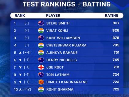 आईसीसी टेस्ट रैंकिंग में ऑस्ट्रेलिया के पूर्व कप्तान स्टीव स्मिथ 937 अंकों के साथ पहले स्थान पर मौजूद हैं, जबकि दूसरे स्थान पर मौजूद विराट कोहली के 926 अंक हैं। वहीं केन विलियम्सन 878 अंकों के साथ रैंकिंग में तीसरे नंबर पर बने हुए हैं। ![]()