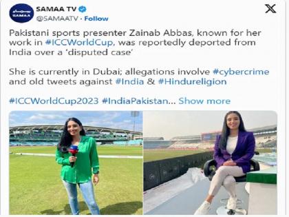 ICC World Cup 2023: पाकिस्तानी खेल प्रस्तोता ज़ैनब अब्बास को कथित तौर पर एक विवादित मामले में भारत से निर्वासित कर दिया गया है। अब्बास को देश छोड़ने के लिए कहा गया है क्योंकि वह पहले भी साइबर अपराध में शामिल रही हैं और उनके पुराने ट्वीट्स में भारत और हिंदू धर्म की आलोचना की गई थी। बताया जा रहा है कि जैनब अब्बास इस वक्त दुबई में हैं। समा टीवी ने पहले ज़ैनब के एक्स पर कथित निर्वासन के बारे में ट्वीट किया था, लेकिन अब इसे हटा दिया है।