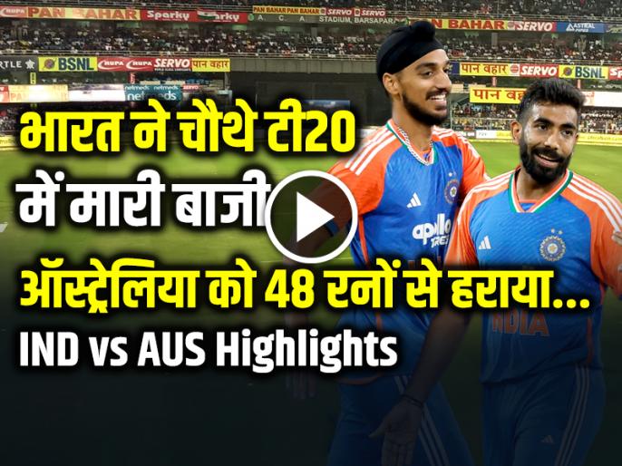 IND vs AUS 4th T20 2025 Full Match Highlights: अक्षर पटेल और वाशिंगटन सुंदर की उम्दा गेंदबाजी से भारत ने बृहस्पतिवार को यहां चौथे टी20 अंतरराष्ट्रीय क्रिकेट मैच में ऑस्ट्रेलिया को 48 रन से हराकर पांच मैच की श्रृंखला में 2-1 की बढ़त बनाई। भारत के 168 रन के लक्ष्य का पीछा करते हुए ऑस्ट्रेलिया की टीम वाशिंगटन सुंदर (तीन रन पर तीन विकेट), अक्षर पटेल (20 रन पर दो विकेट) और शिवम दुबे (20 रन पर दो विकेट) की धारदार गेंदबाजी के सामने 18.2 ओवर में 119 रन पर सिमट गई। ऑस्ट्रेलिया की ओर से कप्तान मिचेल मार्श (30) ही 30 रन के आंकड़े को छू पाए। नाथन एलिस (21 रन पर तीन विकेट) और एडम जंपा (45 रन पर तीन विकेट) ने इससे पहले अंतिम ओवरों में भारत को लगातार झटके दिए जिससे एक समय दो विकेट पर 121 रन बनाकर अच्छी स्थिति में दिख रही मेहमान टीम आठ विकेट पर 167 रन ही बना सकी। भारत की तरफ से सलामी बल्लेबाज शुभमन गिल 39 गेंद में चार चौकों और एक छक्के से 46 रन बनाकर शीर्ष स्कोरर रहे।