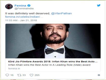 मुंबई में शनिवार यानि 20 जनवरी को आयोजित समारोह में फिल्म अभिनेता इरफान खान को फिल्म 'हिंदी मीडियम' के लिए फिल्मफेयर 2018 का सर्वश्रेष्ष्ठ अभिनेता का पुरस्कार मिला। इसके बाद फेमिना इंडिया मैगजीन ने इरफान खान को बधाई दी, लेकिन उनसे बड़ी गलती हो गई।