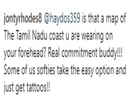 इस तस्वीर के बाद जहां फैंस ने दुख जताया हेडन के जल्द ठीक होने की कामना की वहीं, जॉन्टी ने मजेदार कमेंट करते हुए चेहरे पर चोट के निशान की तुलना तमिलनाडु के नक्शे से कर दी। रो़ड्स ने लिखा, 'हेडन क्या ये नक्शा तमिलनाडु कोस्ट का है, जिसे तुमने अपने माथे पर लगा रखा है!!! कुछ लोग आसान रास्ता अपनाते हैं और टैटू बनाकर रह जाते हैं।'