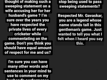 अनुष्का शर्मा ने इंस्टाग्राम पर एक लंबा-चौड़ा पोस्ट शेयर करते हुए लिखा, "मिस्टर सुनील गावस्कर, मैं आपसे कहना चाहती हूं कि आपका बयान काफी गलत है। मैं आपसे पूछना चाहती हूं कि आप ऐसे बयान क्यों देते हैं और एक क्रिकेटर के खेल के लिए उसकी पत्नी को जिम्मेदार क्यों ठहराते हैं?" अनुष्का शर्मा ने आगे लिखा, "कब ऐसा होगा जब मुझे क्रिकेट में घसीटना बंद किया जाएगा और इस तरह की एकतरफा टिप्पणियां नहीं की जाएंगी?' रिस्पेक्टेड मिस्टर गावस्कर, आप एक महान खिलाड़ी हैं जिनका नाम जैंटलमैन के इस खेल में ऊंचा स्थान रखता है। मैं बस आपको बताना चाहती थी कि जब आपने ऐसा कहा तो मुझे कैसा लगा।"