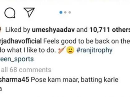 रोहित शर्मा ने इस पर जाधव की खिंचाई कर दी। उन्होंने कमेंट किया- "पोज कम मार, बैटिंग कर ले थोड़ा।"