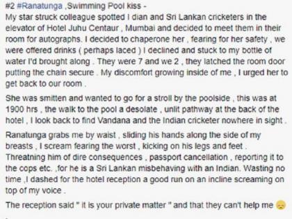 महिला के अनुसार, 'मेरी एक सहकर्मी ने कुछ भारतीय और श्रीलंका के क्रिकेटरों को होटल की लिफ्ट के पास देखा और ऑटोग्राफ के लिए उनसे उनके रूम में मिलने का फैसला किया। मैं उसकी सुरक्षा के लिहाज से उसके साथ गई। हमे ड्रिक्स के लिए पूछा गया लेकिन हममे मना कर दिया। वे सात थे और हम दो। उन्होंने दरवाजे की छिटकनी लगा दी। मेरे अंदर घबराहट बढ़ती जा रही थी और मैंने अपनी सहकर्मी से जल्दी वहां से निकलने को कहा। हालांकि, मेरी दोस्त एक भारतीय क्रिकेटर के साथ पूल की ओर चली गई। मेरे अकेले होते ही रणतुंगा ने तब मेरी कमर को पकड़ा और उसके हाथ मेरे ब्रेस्ट तक चले गये। मैं डर के कारण जोर से चिल्लाई और कमरे से बाहर भागी।'