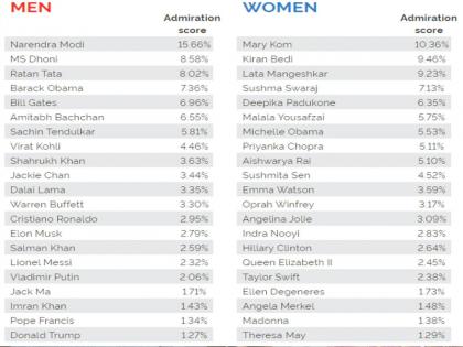 YouGov द्वारा कराए गए इस सर्वे में 41 देशों के 42,000 लोगों ने हिस्सा लिया और दुनिया के सबसे प्रशंसित (Most Admired) पुरुष और महिला का चयन किया। इसमें भारत में पीएम मोदी को सबसे ज्यादा 15.66 % लोगों ने वोट किया और दूसरे नंबर पर एमएस धोनी रहे, जिन्हें 8.65 प्रतिशत लोगों ने पसंद किया, जबकि महिलाओं की लिस्ट में मैरी कॉम को को सबसे ज्यादा 10.36 प्रतिशत लोगों ने वोट किया। वहीं अगर पूरी दुनिया की बात करें तो बिल गेट्स और मिशेल ओबामा इस लिस्ट में नंबर एक पर रहे।