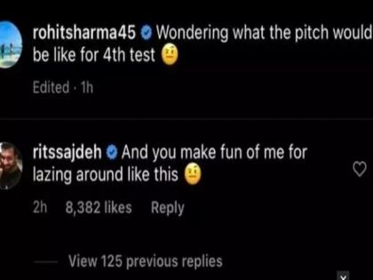 रोहित शर्मा ने इंग्लैंड के खिलाड़ियों की टांग खींचते हुए अपने इंस्टाग्राम अकाउंट पर एक तस्वीर शेयर की, जिसमें वह ग्राउंड पर लेटे हुए नजर आ रहे हैं। इस तस्वीर के कैप्शन में रोहित शर्मा ने लिखा, "सोच रहा हूं चौथे टेस्ट मैच की पिच कैसी होगी।" रोहित की पत्नी रितिका साजदेह ने रोहित की इस तस्वीर पर कमेंट किया है। रितिका ने रोहित को उनकी बातें याद दिलाई है।