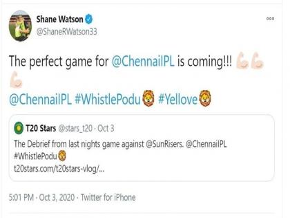 शेन वॉटसन ने 53 गेंद में 83 रन की पारी के दौरान 11 चौके और तीन छक्के लगाए। इस बीच शेन वॉटसन का एक पुराना ट्वीट वायरल हो रहा है। मैच से ठीक एक दिन पहले वॉटसन ने अपने ट्वीट में सीएसके की बड़ी जीत का दावा किया था और उन्होंने निर्णायक भूमिका निभाते हुए ऐसा संभव भी कर दिखाया। वॉटसन ने कहा था कि सीएसके के लिए एक परफेक्ट गेम आ रहा है।
