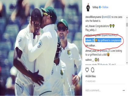 साउथ अफ्रीका के कप्तान फाफ डु प्लेसिस ने लिखा फोटो के साथ लिखा 'दुनिया के नंबर-1 टेस्ट गेंदबाज पर आपको यह मिला है। बहुत शानदारा रबादा, आप यह डिजर्व करते हो चैंपियन।' इसके बाद रबादा ने फोटो पर कमेंट करते हुए लिखा 'मेरी गर्लफ्रेंड इस पर शिकायत कर रही है।'