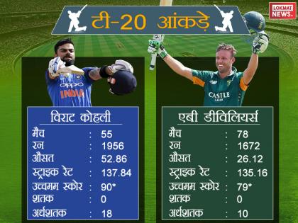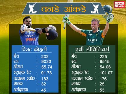 साउथ अफ्रीका दौरे पर गई टीम इंडिया के कप्तान और साउथ अफ्रीका के स्टार बल्लेबाज एबी डिविलियर्स की तुलना हमेशा होती रहती है। हाल ही में कोहली ने डिविलियर्स से कॉम्पटिशन की बात को नकार दिया था। कोहली ने कहा, 'मैं एक इंसान के तौर पर उनका सम्मान करता हूं। लेकिन जब हम एक दूसरे के खिलाफ खेलते हैं तो यह सीमा को लांघने की बात नहीं होती है, हम इस तरह के नहीं हैं।' भारत-दक्षिण अफ्रीका टेस्ट मैच सीरीज से पहले हम आपको बता रहे हैं कोहली और डिविलियर्स के क्रिकेट आंकड़ों के बारे में।