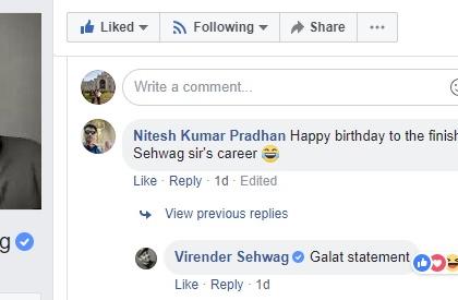 अब जब सहवाग ने धोनी के 37वें जन्मदिन पर उन्हें विश किया तो एक फैन ने फिर से ये चर्चा छेड़ दी, लेकिन इस बार सहवाग ने इस पर जवाब दे दिया। इस फैन ने सहवाग की पोस्ट पर कमेंट किया और लिखा, 'सहवाग के करियर को खत्म करने वाले (धोनी) को हैपी बर्थ डे।' इस पर सहवाग ने तुरंत जवाब दिया और लिखा, 'गलत बयान।'