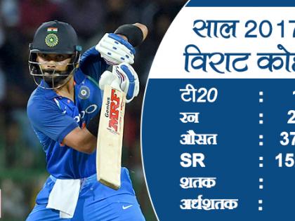 कोहली ने साल 2017 में खेले 10 टी20 मैचों में 37.37 की औसत और 152.55 की स्ट्राइक रेट से 299 रन बनाए हैं। कोहली का टी20 मैचों में शतक नहीं है, लेकिन उन्होंने इस साल 2 अर्धशतक लगाए हैं। इस साल उनका उच्चतम स्कोर 82 रन रहा।