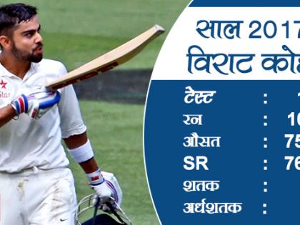 कोहली ने साल 2017 में खेले 10 टेस्ट मैचों की 16 इनिंग्स में 75.64 की औसत और 76.24 की स्ट्राइक रेट से 2 बार नाबाद रहते हुए 1059 रन बनाए हैं। कोहली ने इस साल 5 शतक और 1 अर्धशतक लगाए हैं। इस साल उनका उच्चतम स्कोर 243 रन रहा।