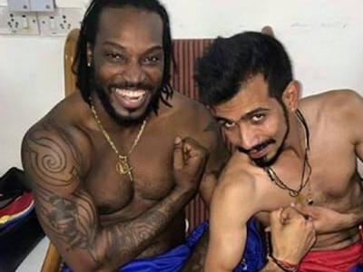 इस तस्वीर में क्रिस गेल और चहल बॉडी बिल्डिंग प्रतियोगिताओं करते नजर आ रहे हैं।