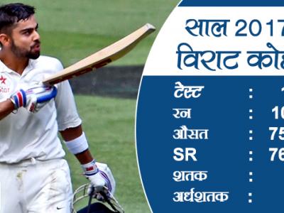 कोहली ने साल 2017 में खेले 10 टेस्ट मैचों की 16 इनिंग्स में 75.64 की औसत और 76.24 की स्ट्राइक रेट से 2 बार नाबाद रहते हुए 1059 रन बनाए। कोहली ने 5 शतक और 1 अर्धशतक लगाए है। इस साल उनका उच्चतम स्कोर 243 रन रहा।