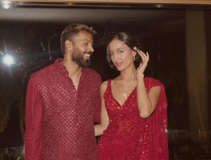 हार्दिक रेड कुर्ता-पायजामा में, तो महीका रेड साड़ी में, ट्रेडिशनल लुक में दोनों बेहद खूबसूरत लगे। (फोटो क्रेडिट: इंस्टाग्राम)