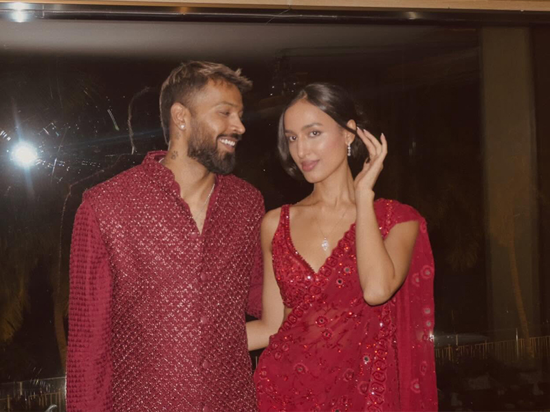 हार्दिक रेड कुर्ता-पायजामा में, तो महीका रेड साड़ी में, ट्रेडिशनल लुक में दोनों बेहद खूबसूरत लगे। (फोटो क्रेडिट: इंस्टाग्राम)