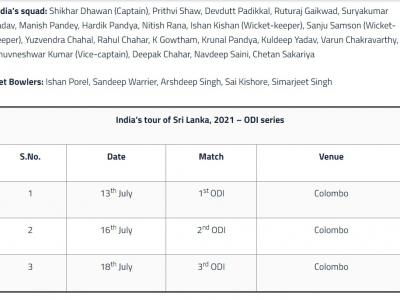 भारतीय टीम- शिखर धवन (कप्तान), पृथ्वी शॉ, देवदत्त पडिक्कल, ऋतुराज गायकवाड़, सूर्यकुमार यादव, मनीष पांडे, हार्दिक पांड्या, नितीश राणा, ईशान किशन (विकेटकीपर), संजू सैमसन (विकेटकीपर), युजवेंद्र चहल, राहुल चाहर, के गौतम , क्रिनल पंड्या, कुलदीप यादव, वरुण चक्रवर्ती, भुवनेश्वर कुमार (उप-कप्तान), दीपक चाहर, नवदीप सैनी, चेतन सकारिया।