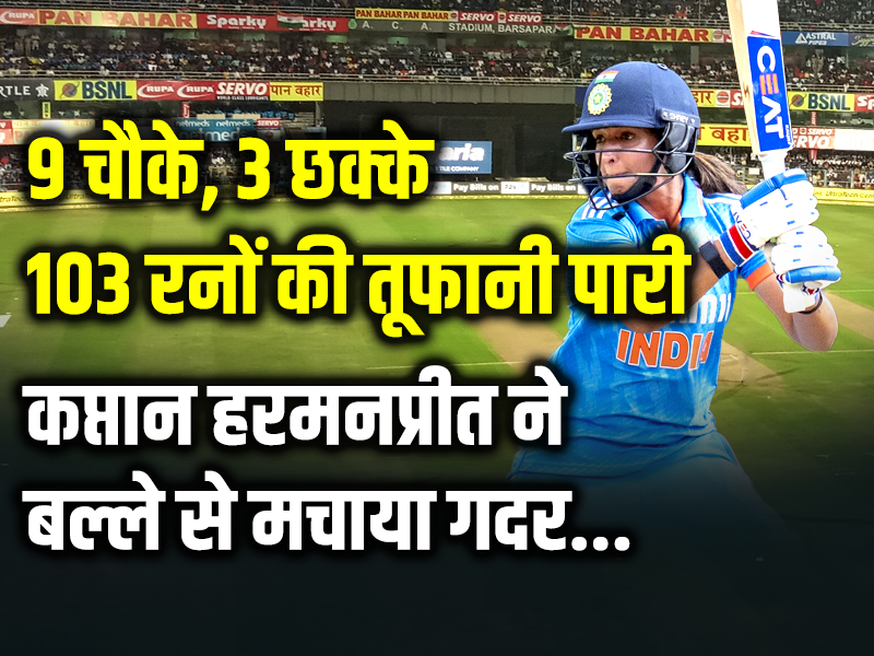 हरमनप्रीत कौर ने 88 गेंदों में 103 रनों की तूफानी पारी खेली है, जिसमें उन्होंने 9 चौके और 3 छक्के लगाये हैं।