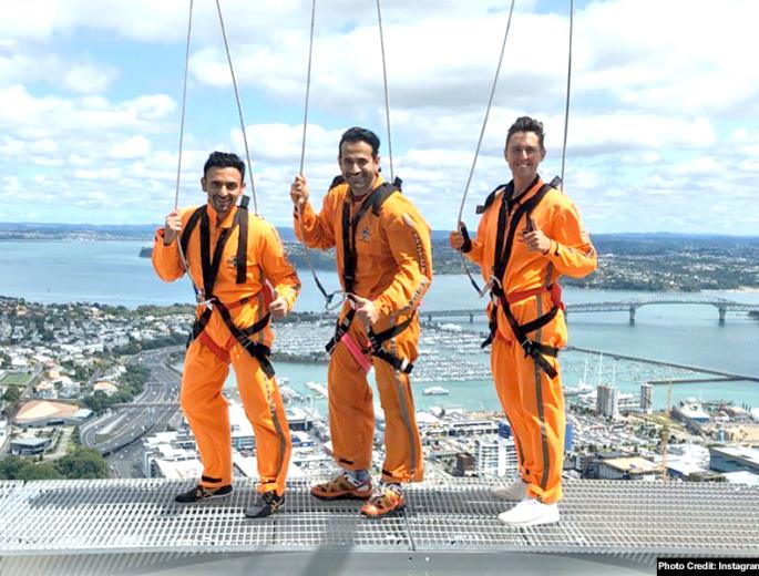और साथ ही उन्होंने कैप्शन लिखा है, Tune in tomorrow @starsportsindia to find whether I jump or not from 629 feet above! I had a great experience at the #skytower with these two fun guys @trrrent_ @jatin_sapru #skytower