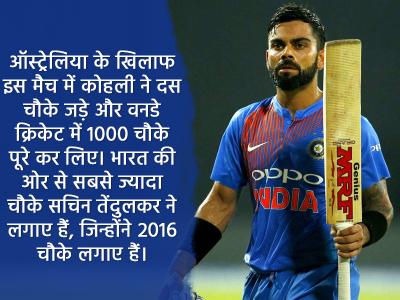 ऑस्ट्रेलिया के खिलाफ इस मैच में कोहली ने दस चौके जड़े और वनडे क्रिकेट में 1000 चौके पूरे कर लिए। भारत की ओर से सबसे ज्यादा चौके सचिन तेंदुलकर ने लगाए हैं, जिन्होंने 2016 चौके लगाए हैं।