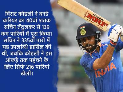 विराट कोहली ने वनडे करियर का 40वां शतक सचिन तेंदुलकर से 139 कम पारियों में पूरा किया। सचिन ने 335वीं पारी में यह उपलब्धि हासिल की थी, जबकि कोहली ने इस आंकड़े तक पहुंचने के लिए सिर्फ 216 पारियां खेलीं।