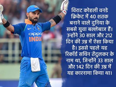 विराट कोहली वनडे क्रिकेट में 40 शतक बनाने वाले दुनिया के सबसे युवा बल्लेबाज हैं। उन्‍होंने 30 साल और 212 दिन की उम्र में ऐसा किया है। इससे पहले यह रिकॉर्ड सचिन तेंदुलकर के नाम था, जिन्होंने 33 साल और 142 दिन की उम्र में यह कारनामा किया था।