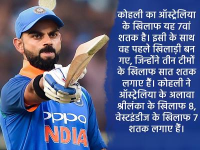 कोहली का ऑस्ट्रेलिया के खिलाफ यह 7वां शतक है। इसी के साथ वह पहले खिलाड़ी बन गए, जिन्‍होंने तीन टीमों के खिलाफ सात शतक लगाए हैं। कोहली ने ऑस्ट्रेलिया के अलावा श्रीलंका के खिलाफ 8, वेस्टइंडीज के खिलाफ 7 शतक लगाए हैं।
