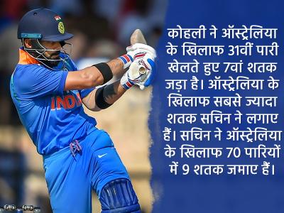कोहली ने ऑस्ट्रेलिया के खिलाफ 31वीं पारी खेलते हुए 7वां शतक जड़ा है। ऑस्ट्रेलिया के खिलाफ सबसे ज्यादा शतक सचिन ने लगाए हैं। सचिन ने ऑस्ट्रेलिया के खिलाफ 70 पारियों में 9 शतक जमाए हैं।
