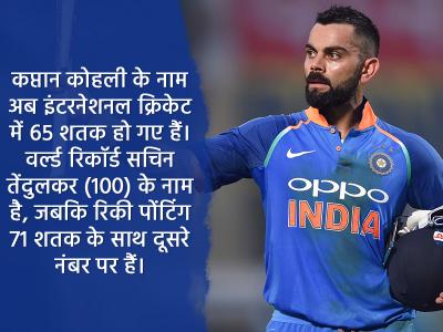 कप्‍तान कोहली के नाम अब इंटरनेशनल क्रिकेट में 65 शतक हो गए हैं। वर्ल्‍ड रिकॉर्ड सचिन तेंदुलकर (100) के नाम है, जबकि रिकी पोंटिंग 71 शतक के साथ दूसरे नंबर पर हैं।