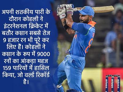 अपनी शतकीय पारी के दौरान कोहली ने इंटरनेशनल क्रिकेट में बतौर कप्तान सबसे तेज 9 हजार रन भी पूरे कर लिए हैं। कोहली ने कप्तान के रूप में 9000 रनों का आंकड़ा महज 159 पारियों में हासिल किया, जो वर्ल्ड रिकॉर्ड है।