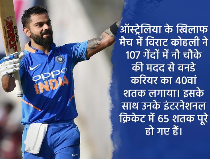 ऑस्ट्रेलिया के खिलाफ मैच में विराट कोहली ने 107 गेंदों में नौ चौके की मदद से वनडे करियर का 40वां शतक लगाया। इसके साथ उनके इंटरनेशनल क्रिकेट में 65 शतक पूरे हो गए हैं।