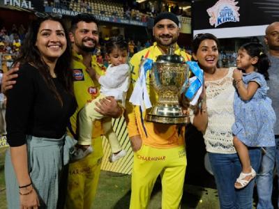 हरभजन सिंह और सुरेश रैना ने भी अपनी पत्नी और बच्चों के साथ ट्रॉफी जीतने की खुशी मनाई।