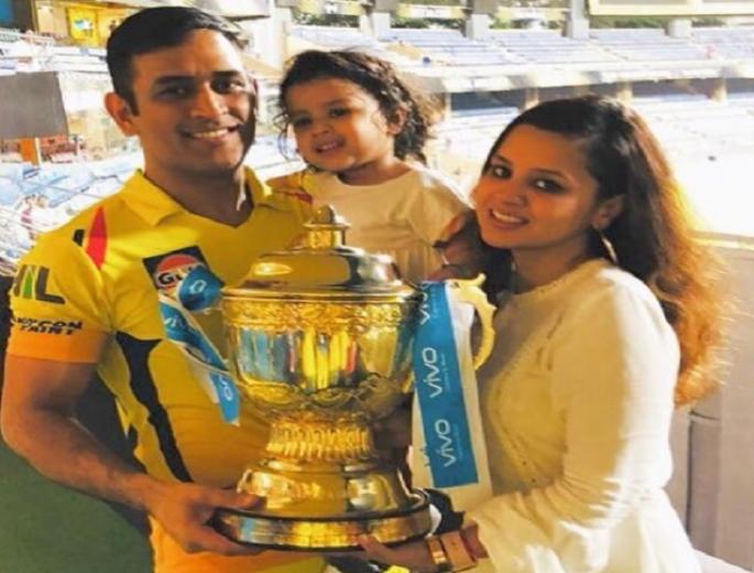 मैच खत्म होने के बाद सीएसके के खिलाड़ियों के बीच धोनी और साक्षी अपनी बेटी जीवा के साथ।