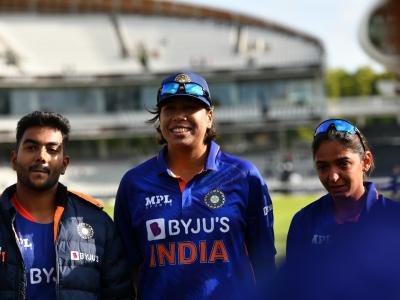 भारतीय कप्तान हरमनप्रीत कौर शनिवार को लार्ड्स पर इंग्लैंड के खिलाफ तीसरे वनडे में टॉस के लिये झूलन गोस्वामी को लेकर मैदान में पहुंची जिनका यह विदाई मैच होगा।