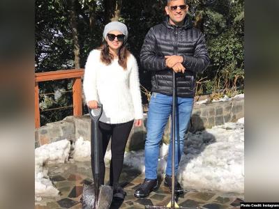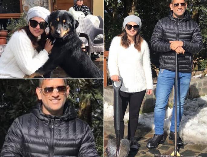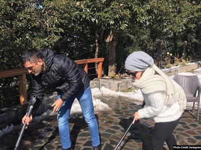 वहीं दूसरे फोटो में वह धोनी के साथ बर्फ साफ करती हुई भी नजर आ रही हैं।