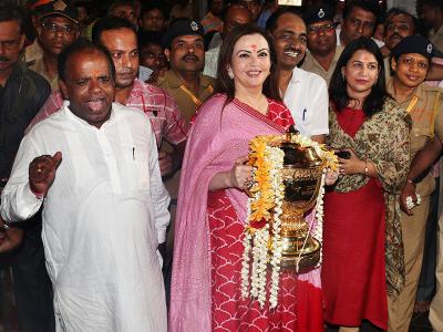 मुकेश अंबानी की पत्नी नीता अंबानी मुंबई इंडियंस की ट्रॉफी को लेकर सिद्धिविनायक मंदिर भी पहुंचीं।