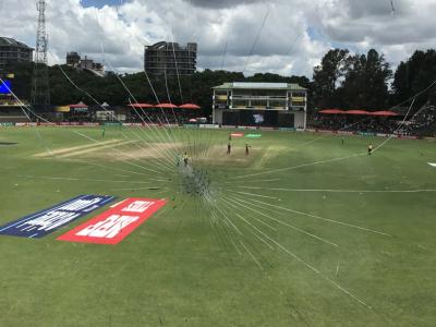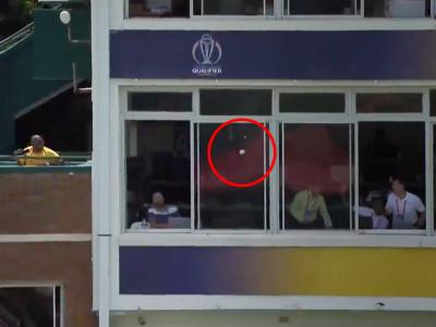 आईसीसी ने पावेल के छक्के से टूटे प्रेस बॉक्स के कांच की ये सभी तस्वीरें शेयर की है।