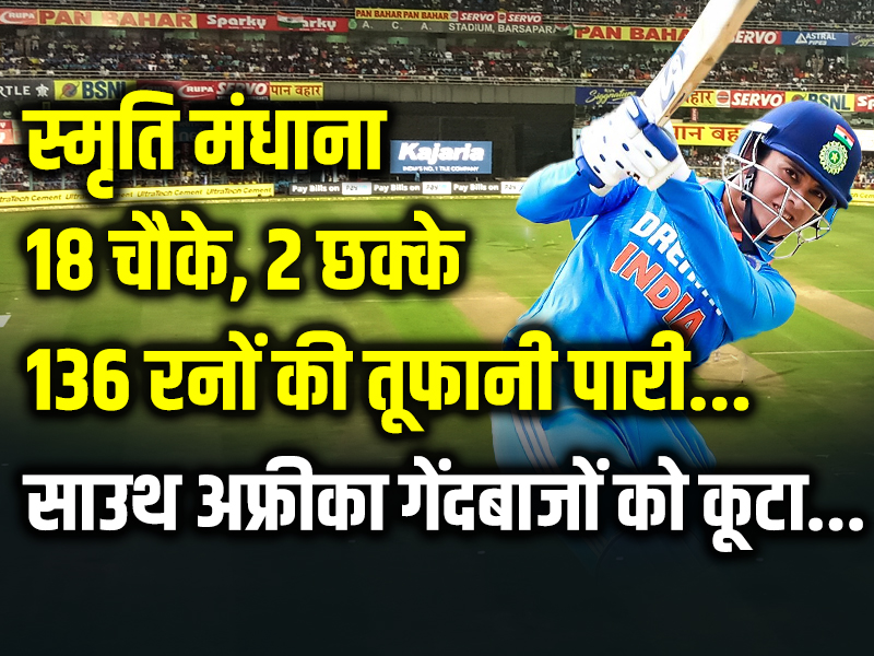 पहले वनडे में 127 गेंद में 117 रन की पारी खेली थी। दूसरे मैच में 120 गेंद में 136 रनों की पारी खेली। जिसमें 18 चौके और दो छक्के शामिल हैं, मंधाना अंतरराष्ट्रीय क्रिकेट परिषद (आईसीसी) की नवीनतम महिला एकदिवसीय बल्लेबाजी रैंकिंग में दो पायदान ऊपर तीसरे स्थान पर पहुंच गईं।