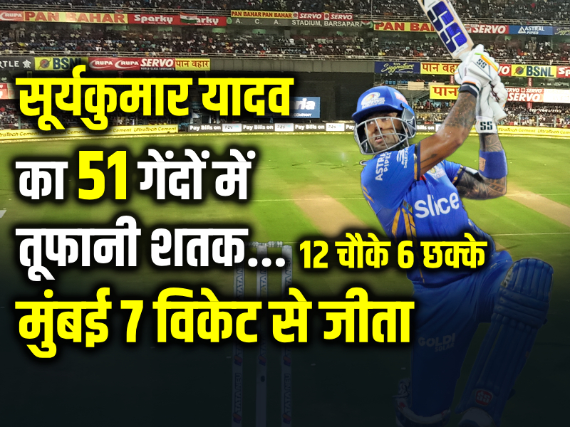 मुंबई की इस जीत में सूर्यकुमार यादव चमके। उन्होंने 51 गेंदों में नाबाद 102 रनों की पारी खेली। सूर्या ने अपनी शतकीय पारी में 12 चौके और 6 छक्के लगाए। जबकि तिलक वर्मा ने उनका बखूबी साथ दिया। जिन्होंने 32 गेंदों में 37 रनों की पारी खेली। स्काई के बल्ले से यह शतक उस समय निकला, जब टीम ने 31 रन पर अपने तीनों शीर्ष बल्लेबाजों को गंवा दिया था।