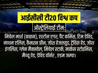 11- ऑस्ट्रेलियाई टीम: मिचेल मार्श (कप्तान), एश्टोन एगर, पैट कमिंस, टिम डेविड, नाथन एलिस, कैमरन ग्रीन, जोश हेजलवुड, ट्रेविस हेड, जोश इंगलिस, ग्लेन मैक्सवेल, मिचेल स्टार्क, मार्कस स्टोइनिस, मैथ्यू वेड, डेविड वॉर्नर , एडम जम्पा।