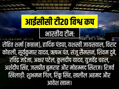 12- भारतीय टीम: रोहित शर्मा (कप्तान), हार्दिक पंड्या, यशस्वी जायसवाल, विराट कोहली, सूर्यकुमार यादव, ऋषभ पंत, संजू सैमसन, शिवम दुबे, रविंद्र जडेजा, अक्षर पटेल, कुलदीप यादव, युजवेंद्र चहल, अर्शदीप सिंह, जसप्रीत बुमराह और मोहम्मद सिराज।